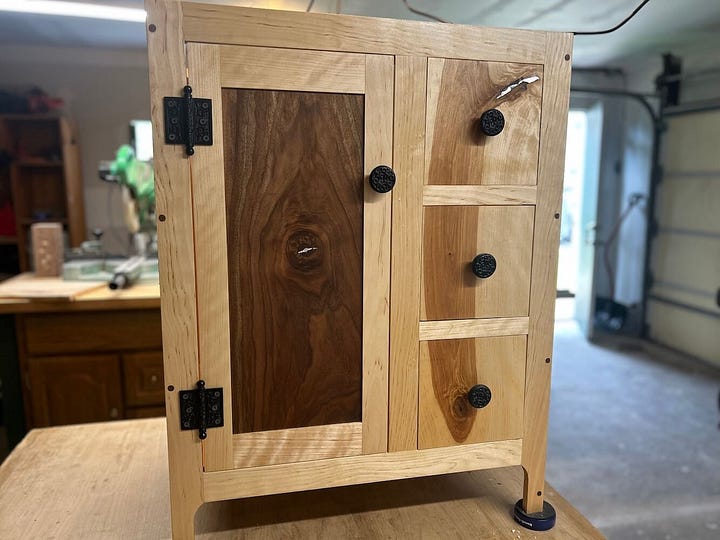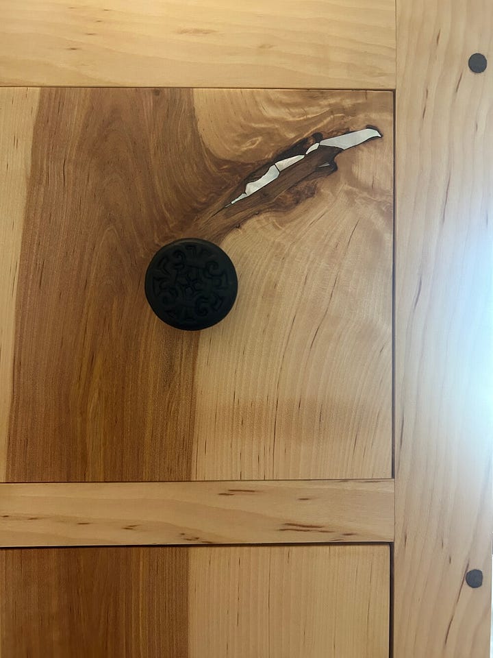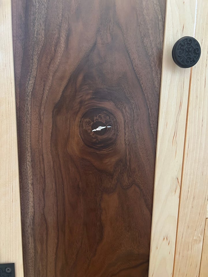 Some photos of my recent work—this is the sink vanity for my friends (the second part of the commission I mentioned last time). There was a crack in the walnut panel I wanted to use for the door and a knot in the board I wanted to use for the drawer fronts. I save slivers and scraps of pearl from other projects, so I went through that pile and reshaped some of them to fill the cracks. When possible, I like to incorporate blemishes in the wood into the work I do. I’m fascinated by imperfections, by the material that we deem less than worthy.