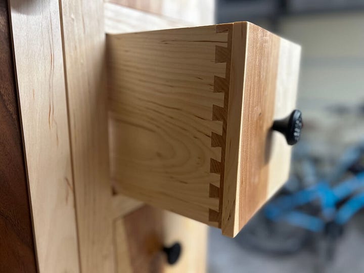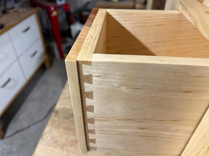 A quick aside: “half blind” means the dovetails are only visible on the sides of the box, as they only go halfway through the back and front pieces of wood. “Dovetails” are interlocking pins and tails (don’t ask me which is which because I can never remember) cut into the ends of two boards to make a 90-degree joint that is quite sturdy and can hold up to years, decades of use. Some woodworkers cut these by hand. Some are cocky about their ability to do that. I’m neither.